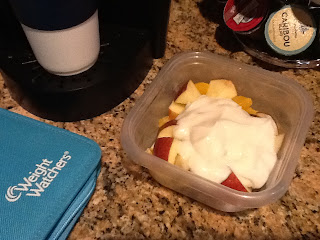 Friday involves a WW meeting, followed by the gym, followed by lunch. I hate to eat anything before I weigh in, and I usually take a coffee and a protein bar, but I’m trying to change things up a bit, and save some of my moring points for my Friday night out. WW really focuses on Power Foods. Those are mostly fruits and veggies, lean meats and whole grains, and skim milk and I believe non-fat yogurt. So for my breakfast I chopped up an orange and an apple and topped it with 1/3 C. of fat free WW vanilla yogurt. Total = 1 PPV. Instead of hitting the Starbucks drive through for my Misto (half coffee, half steamed skim milk) I used my new toy that my husband got me for my birthday, my Keurig! My coffee drink with a packet of sweetner = 0 PPV! My previous breakfast of a protein bar (5 PPV) and a Misto (2 PPV) is something I will still enjoy, just a little less frequently.
