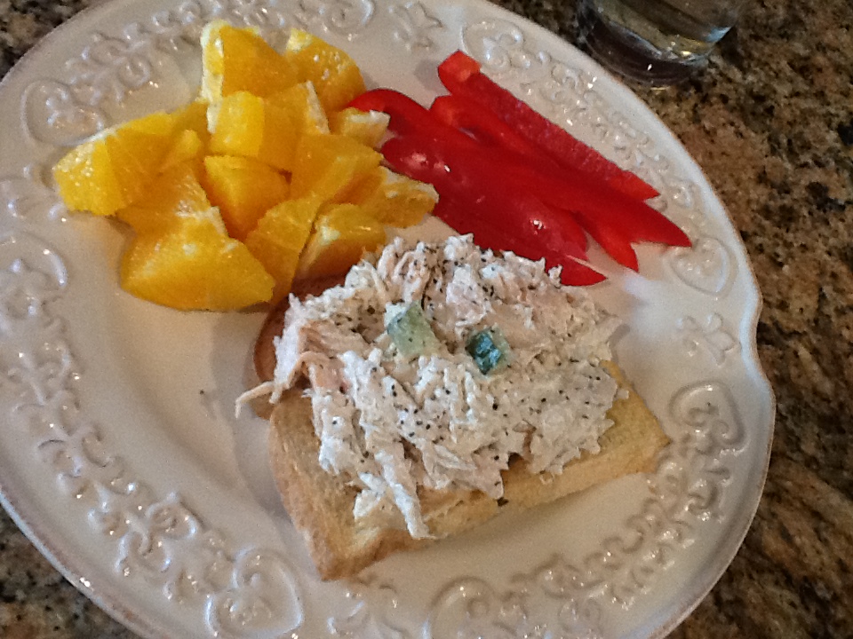 Today? I mixed 1 T. of Tzatziki sauce (1 PPV) with 4 oz. of rotisserie chicken (3 PPV) and put it on a toasted piece of Lite Italian Bread (1 PPV)! I love to have something crunchy to eat with my sandwiches, so lately I opt for some 0 PPV crunchy veggies. This time I chose red bell pepper. I love the sweetness they have.